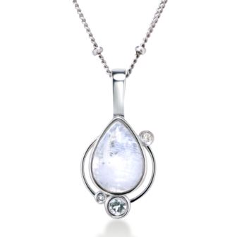 Capture the luminous magic of the night sky with this sterling silver moonstone pendant necklace. A genuine 10x7mm moonstone, framed in sterling silver and encircled by radiant white topaz, mirrors the celestial rhythm of orbiting stars. Suspended from an 18" Saturn chain, it glows with ethereal elegance-perfect for dreamers, mystics, and lovers of quiet beauty.
