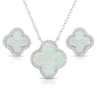 Designer-inspired clover earrings and necklace with opals and white sapphires for added radiance and sparkle. Perfect for jeans and a T-shirt or dressed up for the evening. Suspended from an 18" cable chain with a spring ring clasp. Sterling silver with yellow gold overlay