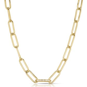 Elevate your look with this classic paperclip necklace with a twist. This timeless 14k yellow gold plated brass paperclip necklace offers a minimalist yet sophisticated look. The middle link is encrusted with brilliant cut cubic zirconia's for added sparkle. Perfect for accessorizing a night out or an everyday look, this necklace is a jewelry box must-have. 14k yellow gold plated brass. 18" length, White Cubic Zirconia's.