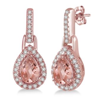 The ultimate in luxury - genuine morganite earrings. Stunning 6x4mm pear shaped morganite set in 10k rose gold with .20twt round diamonds. Matches well with necklace JN6109 and ring JR6109.