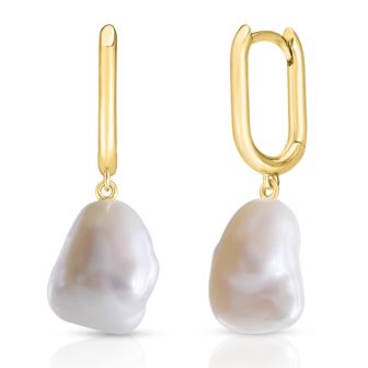 Each completely unique in shape and natural nuances, these Baroque pearl hoops will turn up the volume on any look. 8-9mm Baroque shimmering white pearls on the bottom of 13mm French oval hoops give them graceful movement when worn, making these glam earrings the main attraction. Rhodium plated brass. Secured to the ears with hinged closures.