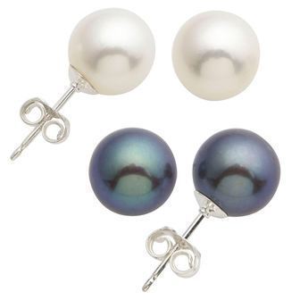 Classic black and white pearl stud earring set. 9mm cultured freshwater pearls set in sterling silver.