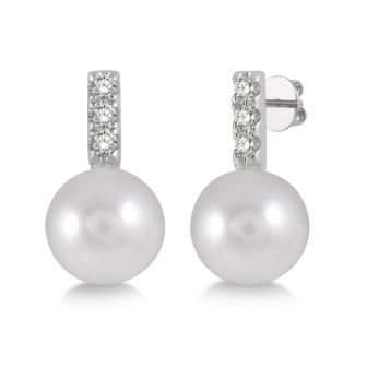 These pearl and diamond bar earrings are the style your jewelry box needs. The simplicity and sleek design of the 14k white gold bars set with .10twt round cut diamonds finished with 7mm freshwater pearls allow you to wear them for any occasion. Secured with a push back closure and offers ease of use. Pearls and diamonds pair well to create timeless style and countless options for elegant, everyday wear.