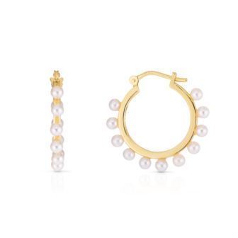 Alluring pearl hoops- 3.5mm freshwater pearl hoops. These fashionable hoops are easy to wear day or night- jeans or a pretty dress. Perfect for every occasion. 20mm hoops, sterling silver with 14k yellow gold plating