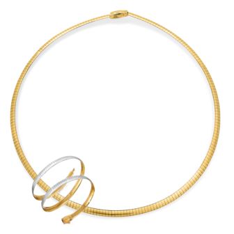 Striking from every angle, this 14k yellow gold and sterling silver reversible omega chain offers two looks in one. Whether you're channeling golden radiance or silver sleekness, the polished finish and bold profile deliver modern elegance with Italian craftsmanship. Designed to sit gracefully at the collarbone, this 16" necklace secures with a box clasp and makes a versatile statement-day or night, casual or couture. Flip it to fit your mood.