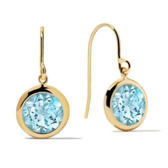 Contemporary over sized bursts of color to enhance your style. 10mm round genuine blue topaz bezel set in 14k yellow gold vermeil (3 micron 14k yellow gold over solid sterling silver). Lovely French wires for comfort and design.