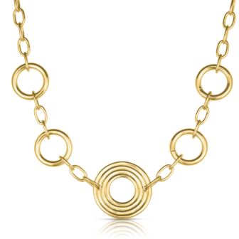 Make a lasting impression in this art deco-inspired statement necklace featuring round and oval links that cascade down the neck to meet with a gorgeous art deco-inspired tiered circular pendant. This statement style gives a vintage-inspired look in an extremely artful and wearable manner. 14k yellow gold plated brass, 18" length.Secured to the neck with a lobster law clasp.