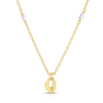 Inspired by organic shapes, this open work pendant necklace reflects the texture of molten rock with its organic curves to create a distinctive design. Style solo or with a chunky chain for a bold statement look. Paired with a bobble chain featuring organic shaped rice pearls on a 14k yellow gold plated brass chain, this necklace provides a look that's dainty, romantic and refined. 14k yellow gold plated brass16"+2" extender, 2-2.5mm rice pearls. Secured to the neck with a spring ring clasp.