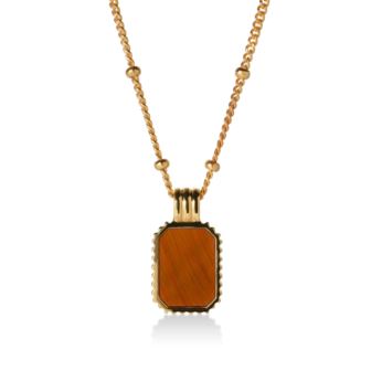 Elevate your look with this 18k yellow gold plated sterling silver Tiger's Eye pendant necklace. Featuring a polished rectangular-cut Tiger's Eye framed in a textured bezel, the pendant hangs from an 18" saturn chain for added texture. Known for its warm golden-brown tones and grounding energy, Tiger's Eye brings both beauty and meaning to this modern classic.