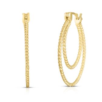 For when delicate earrings just won't do. These twisted rope double hoop earrings are crafted with double the exquisiteness in 14k yellow gold vermeil (2.5 microns thick of 14k yellow on top of a sterling silver base). The glistening loops, one larger than the other, are connected to hinged clip closures. The high-shine rope design lends an extra hint of extravagance to these striking hoop earrings.