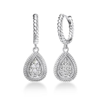 "Dazzle with timeless elegance in our Sterling Silver White Sapphire Hoops. Each 15mm twisted rope motif hoop cradles a delicate teardrop charm, shimmering with brilliant white sapphires. Crafted from exquisite sterling silver, these earrings capture light beautifully, offering a sophisticated sparkle perfect for any occasion.Also available in 18k yellow gold plated sterling silver"