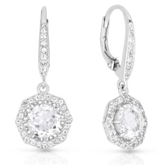 Beautiful droplet earrings- white topaz clusters suspended from lever backs and surrounded by a halo of white topaz. 7.5mm round brilliant white topaz set in sterling silver