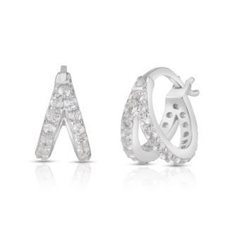 Our favorite wear everyday huggie earring times two is just a no brainer. Get the look of two hoop earrings in one with this sterling silver and white topaz huggie, two hoops that come together and meet in the back creating a perfect two in one earring. Secured to the ears with hinged latch backs.