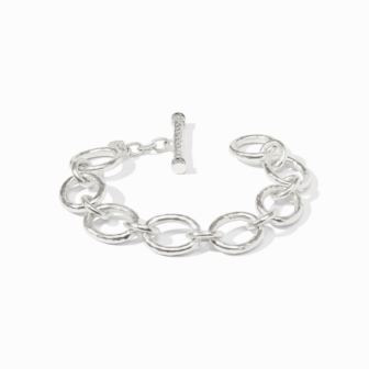 A luxurious bracelet of lightly hammered silver links, finished with a toggle closure. Pure silver plate (tarnish-free). Inner circumference: 8 inches. Width: 0.6 inches. Closes with toggle. Julie Vos hallmark