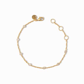 Introducing the Celeste Delicate Bracelet-an ethereal adornment as delicate as a wisp of air, yet radiating with profound beauty. Seven small stones, like celestial whispers, punctuate this quietly elegant bracelet, creating a subtle and sweet style statement that speaks volumes of grace and sophistication. With each gentle movement, the Celeste bracelet captures the essence of romance, weaving an enchanting tale of love and devotion. Embrace the subtle elegance of Celeste, and let your wrist be adorned with the magic of whispered affections. 24K gold plate. 6.25-6.75-7.25" adjustable length. Cubic Zirconia. Lobster Clasp Closure.