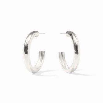 This hoop's lightly hand-hammered finish belies its simplicity by catching and scattering light for maximum impact. Pure silver plate (tarnish-free). 1.3 inches (medium). Includes pure silver- plated earring backs. Post for pierced ears. Julie Vos hallmark.