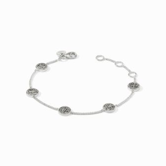 Five petite silver coin stations on a delicate chain. Pure silver plate (tarnish-free). Inner circumference: 6 / 6.5 / 7 inches (adjustable). Width: 0.3 inches. Closes with lobster clasp. Julie Vos hallmark.