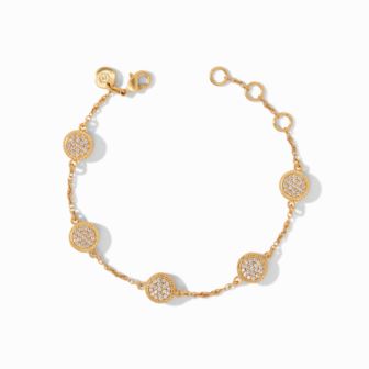 Indulge in the allure of romance with the Windsor Delicate Bracelet-a shimmering masterpiece destined to captivate hearts. Adorned with five dazzling pavé stations, this bracelet glimmers like stars in a midnight sky, casting a spell of enchantment wherever you go. Its slender chain delicately drapes around your wrist, whispering tales of love and elegance with every movement. Embrace the magic of the moment and let the Windsor Delicate Bracelet be the sparkling symbol of your everlasting affection. 24K gold plate. Adjustable length 6-6.5-7".