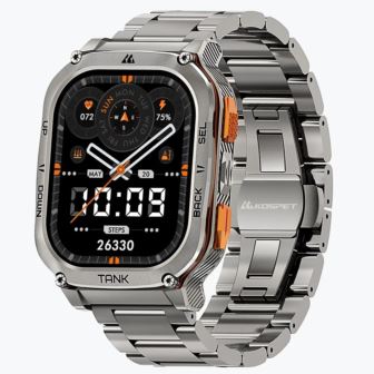 The KOSPET TANK M3 Ultra Special Edition is a high-performance rugged smartwatch with dual-band GPS, 6 satellite-positioning systems, compass, barometric altimeter, G-sensor, 170+ sports modes, smart sleep tracking, and 5 ATM waterproofing. It combines pro-level tracking with a bold rectangular design with an always-on AMOLED display - ideal for outdoor training, swimming, and everyday adventure. This rugged smartwatch meets MIL-STD-810H standards. Fits wrist diameters 5.75 in. to 9.37 in.