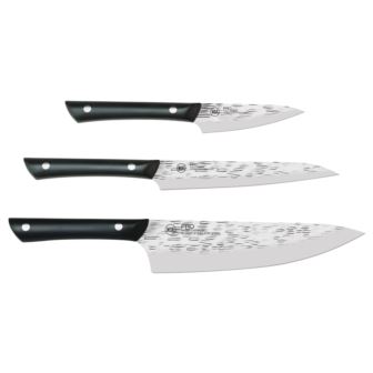 Includes 3.5" pairing, 6" multi-utility, 8" chef's knives with blade guards. Imported Japanese AUS6M corrosion-resistant stainless steel blades, NSF Certified. Full-tang construction and a riveted POM handle will provide a lifetime of pro-level performance. Double bevel cutting angle 16 degrees each side. Striking, hammered blade finish not only look good, but are functional. Makes Shun the sharpest knives out of the box. Shun is hottest selling gourmet knife brand in the country.