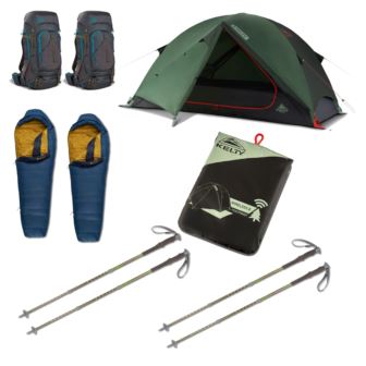 2 pairs of light and compact hiking poles that are adjustable in length and have a padded wrist strap. 2 - 20 degree 550 fill down sleeping bags with dual slider for ventilation with locking zippers and a zippered internal stash pocket. 2 - 85L backpacks with zippered sleeping bag compartment, large front zippered pocket, and trail stash pocket. 2-person tent and footprint with easy set-up and duffle for storage.