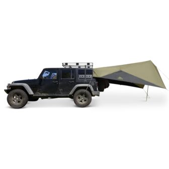 The Waypoint Screenhouse Tarp is a semi-universal vehicle attachment with more sun, wind and rain protection tan traditional automotive awnings. It is made of 68D polyester and has a simple and sturdy one pole design. Heavy duty stakes and guy lines are included. Comes with a Shark Mouth duffel for easy pack-up and crossbody transport. 132.5" x 88"