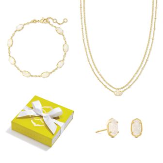 Wear this 3pc Set from Kendra Scott and experience the sparkle. Pull off the layered look with the Emilie Gold Multi Strand Necklace in Iridescent Drusy. A mini version of our most iconic silhouette, pre-layered for throw-on-and-go wear. 0.25' X 0.20' station, 15.5' chain + 3'. The Emilie Gold Link Bracelet in Gold Iridescent Drusy is designed with mini, classic KS shapes linked by a shimmery metallic satellite Chain. Layer for a little extra something in your minimalist stack! 6.5"L circumference 0.25x 0.20" stations. Here's to a mini moment! Petite with a wink of sparkle the Emilie Gold Stud Earrings in Gold Iridescent Drusy feature an iconic shape in an all-new micro size. Add to your curated ear, or style alone as a minimalist everyday stud. .032L x 0.2" W
