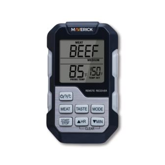 Grill with confidence using the Maverick Single Probe Barbecue Thermometer and Timer. Monitor your cook without opening the grill, preserving heat for consistent results. Set custom or preset temps for nine meats, track progress with the color-changing backlight, and use count-up/count-down timers with alerts. Heat-resistant probe and versatile receiver make grilling precise, convenient, and flexible.