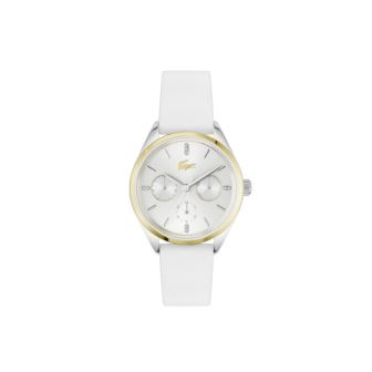 Lacoste Atena Ladies Watch. 34MM Stainless Steel and yellow Gold IP case. Silver White multi-function Dial. White Silicone Strap with Tongue buckle . Mineral Crystal. Water resistant to 5 ATM. Quartz Multi-function Movement