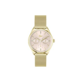Lacoste Atena Ladies Watch. 34MM Yellow Gold IP case. Blush multi-function Dial. Yellow Gold IP Mesh Bracelet with sliding buckle . Mineral Crystal. Water resistant to 5 ATM. Quartz Multi-function Movement