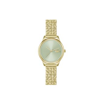 Lacoste Mini Crocodelle Ladies Watch. 28MM Yellow Gold IP case. Green Dial. Yellow Gold IP Textured Mesh Bracelet with sliding buckle . Mineral Crystal. Water resistant to 5 ATM. Quartz Movement