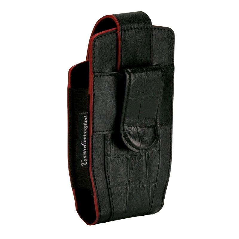 Crocodile-embossed polished leather, luxurious black velvet lining and red trim, magnetic flap clsoure, elastic sides and belt clip.