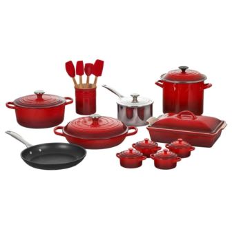 The 20-piece Mixed Material cookware set features a curated collection of our most popular cookware, bakeware and tools, including our iconic Dutch oven, highly rated Braiser and Toughened Nonstick fry pan. The versatile set is ideal for those just starting to build a Le Creuset collection or wanting to expand upon an existing one. It also makes an excellent gift for weddings, showers, housewarming and for the person who loves to cook and entertain. Set includes: 7 1/4 qt. Round Dutch Oven, 5 qt. Braiser, 3 qt. Stainless Steel Saucepan, 12 in. Toughened Nonstick PRO Fry Pan, 4 qt. Heritage Rectangular Casserole, Set of 4 Mini Round Cocottes, 8 qt. Stockpot, Craft Series Utensil Set.
