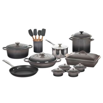 The 20-piece Mixed Material cookware set features a curated collection of our most popular cookware, bakeware and tools, including our iconic Dutch oven, highly rated Braiser and Toughened Nonstick fry pan. The versatile set is ideal for those just starting to build a Le Creuset collection or wanting to expand upon an existing one. It also makes an excellent gift for weddings, showers, housewarming and for the person who loves to cook and entertain. Set includes: 7 1/4 qt. Round Dutch Oven, 5 qt. Braiser, 3 qt. Stainless Steel Saucepan, 12 in. Toughened Nonstick PRO Fry Pan, 4 qt. Heritage Rectangular Casserole, Set of 4 Mini Round Cocottes, 8 qt. Stockpot, Craft Series Utensil Set.