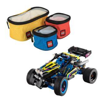 Keep Lego bricks and pieces tidy and easily accessible with this set of 3 organizer cubes. In 3 different sizes, the cubes are just right for sorting or transporting Lego parts or small builds. Practical touches include a clear window, making it easy to see what's inside, plus a zipper closure to keep everything safe. When not in use, the blue and red cubes fit inside the yellow cube for easy storage. To get your collection started this Kit includes the Lego Off-Road Race Buggy.