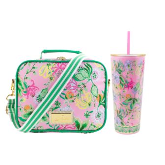 Take your favorites to go the Lilly way with this portable lunch bundle. The large lunch tote is easy-to-clean with an insulated interior. With a top handle and adjustable strap, this lunch cooler makes it super easy to take when you're on the go. Sip in style with this 20oz printed acrylic tumbler. Complete with a gold twist-off lid and reusable straw, it's equal parts fashionable and functional.