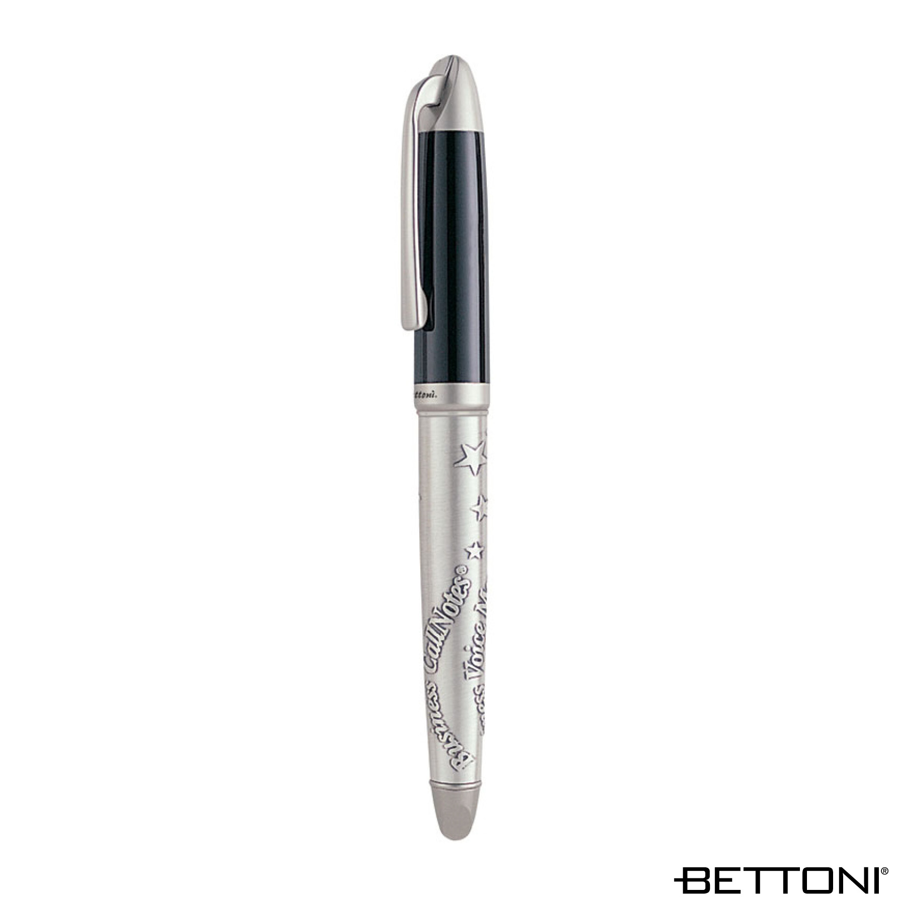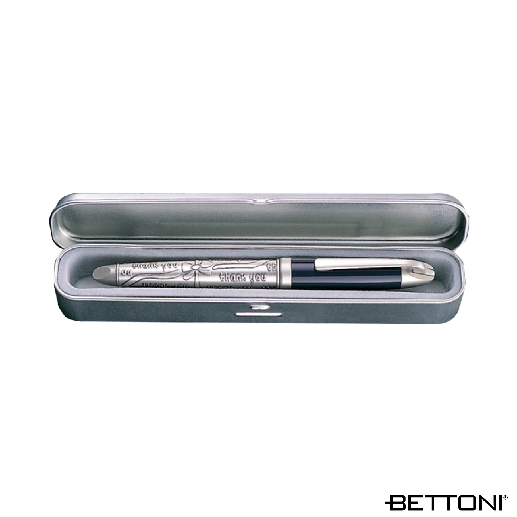 Create your own custom barrel design for the Bettoni Coriano ballpoint pen. Have your logo laser engraved on the cap. Solid heavyweight brass, distinctive sculptured barrel design, spring loaded clip, cap-off design, USA made ballpoint refill, includes tin box (GB031), ink color: black.