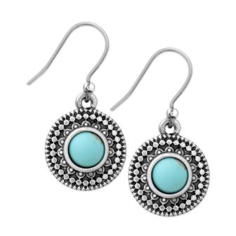 These bold drop earrings feature a stunning turquoise stone that will add a pop of color to any outfit. Wear them anytime for a chic finishing touch. French wire earring in silver-tone. Turquoise center stone. Pierced. 1" drop.