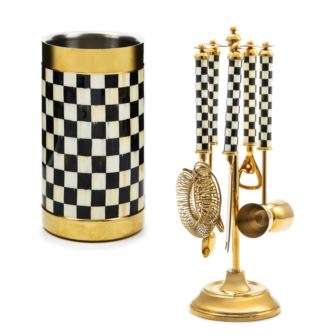 Give your home bar the stylish touch of our most popular pattern. Made of gold-toned stainless steel with an enamel coating of our color-dragged checks, the Courtly Check 3260 Gold Wine Cooler holds a bottle of your favorite vintage. Prepare perfect drinks every time with this six-piece bar set made of stainless steel with a gold finish and an enamel coating of Courtly Checks on the handles. The set includes a jigger, strainer, bottle opener, mixing spoon, knife, and shaker, plus an accompanying stand to hold the tools. Bar Tool Set: Stand: 4.5" dia., 13.75" tall; 7" long bottle opener, 9.5" long knife, 8.75" long strainer, 9" long double jigger holds 1 ounce and 1.5 ounces, 10.5" long spoon. Cocktail Shaker - 3" dia., 9" tall, 20 oz. capacity. Wine Cooler Dimensions: 4.75" dia., 7.75" tall.