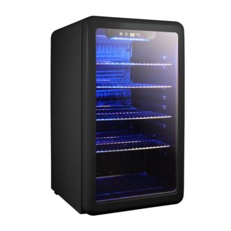 The Magic Chef 3.4 cu. ft. Retro Beverage Cooler in black will be the perfect addition to any dorm, office or rec room. The stylish nostalgic look will complement any décor. The LED blue lighting showcases your beverages. The tinted double pane glass door is more energy efficient than single pane glass and helps prevent condensation. There are 4 removable wire shelves which can be adjusted according to your beverages. This beverage cooler offers a 1-year parts and labor warranty and 5-year compressor part warranty.