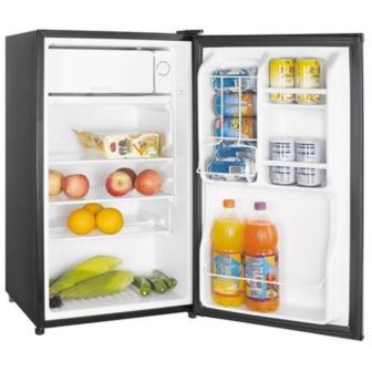 Have limited space but want to keep your snacks and cans or soda cold? This 3.5 cubic foot refrigerator is compact for dorm rooms, apartments, garages (in locations that don't go below 50 deg), and more. Door can be reversed to accommodate space and temperature control has a full range of settings. Door has extra storage and a can dispenser for your favorite drinks. For small frozen snacks use the full width freezer compartment. Stylish black finish on the door and cabinet. Glass shelves for easy cleaning.