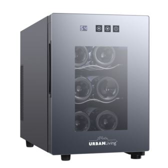 The Urban Living 6-bottle wine cooler offers full-range temperature control, keeping your red and white wines perfectly chilled. Its easy-touch control panel with LED display lets you adjust settings without opening the door, minimizing fluctuations. With a 46F-64F temperature range and quiet thermoelectric cooling, your wine stays perfectly stored. It features a clear glass door, chrome shelves, adjustable legs, and a compact design that fits in any space-ideal for wine lovers seeking a sleek, functional storage solution.