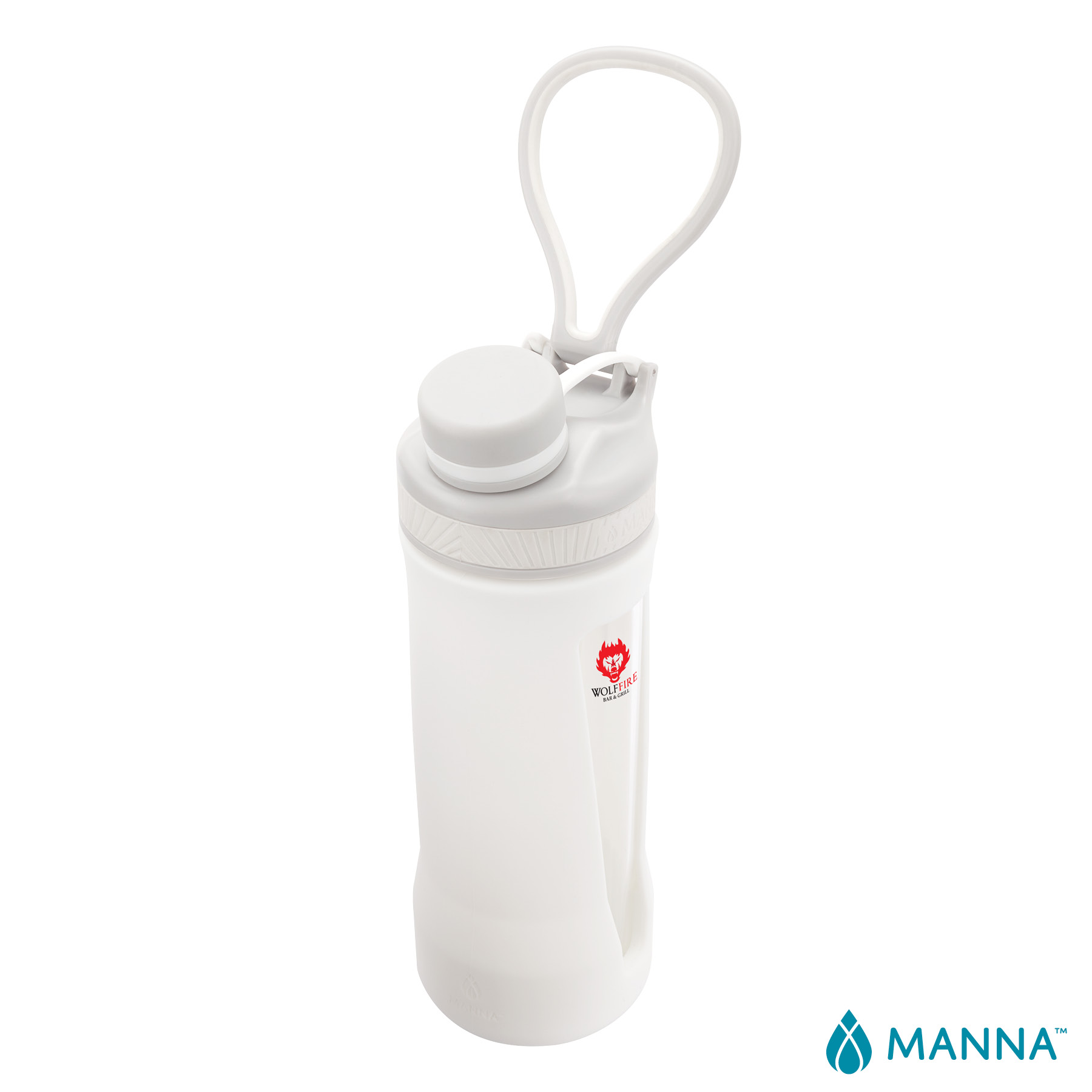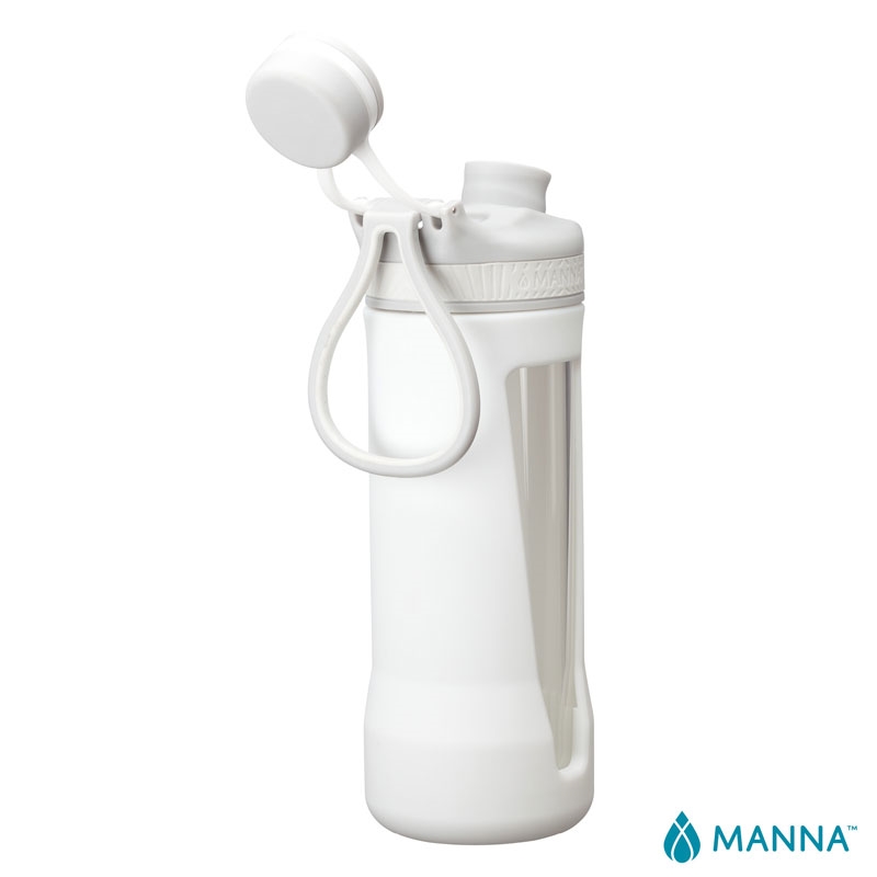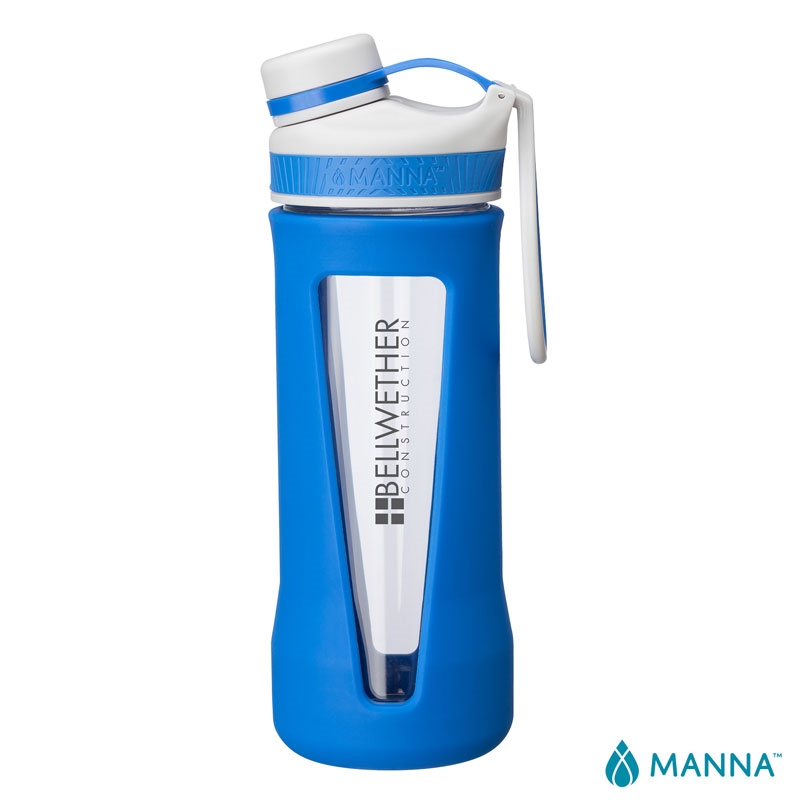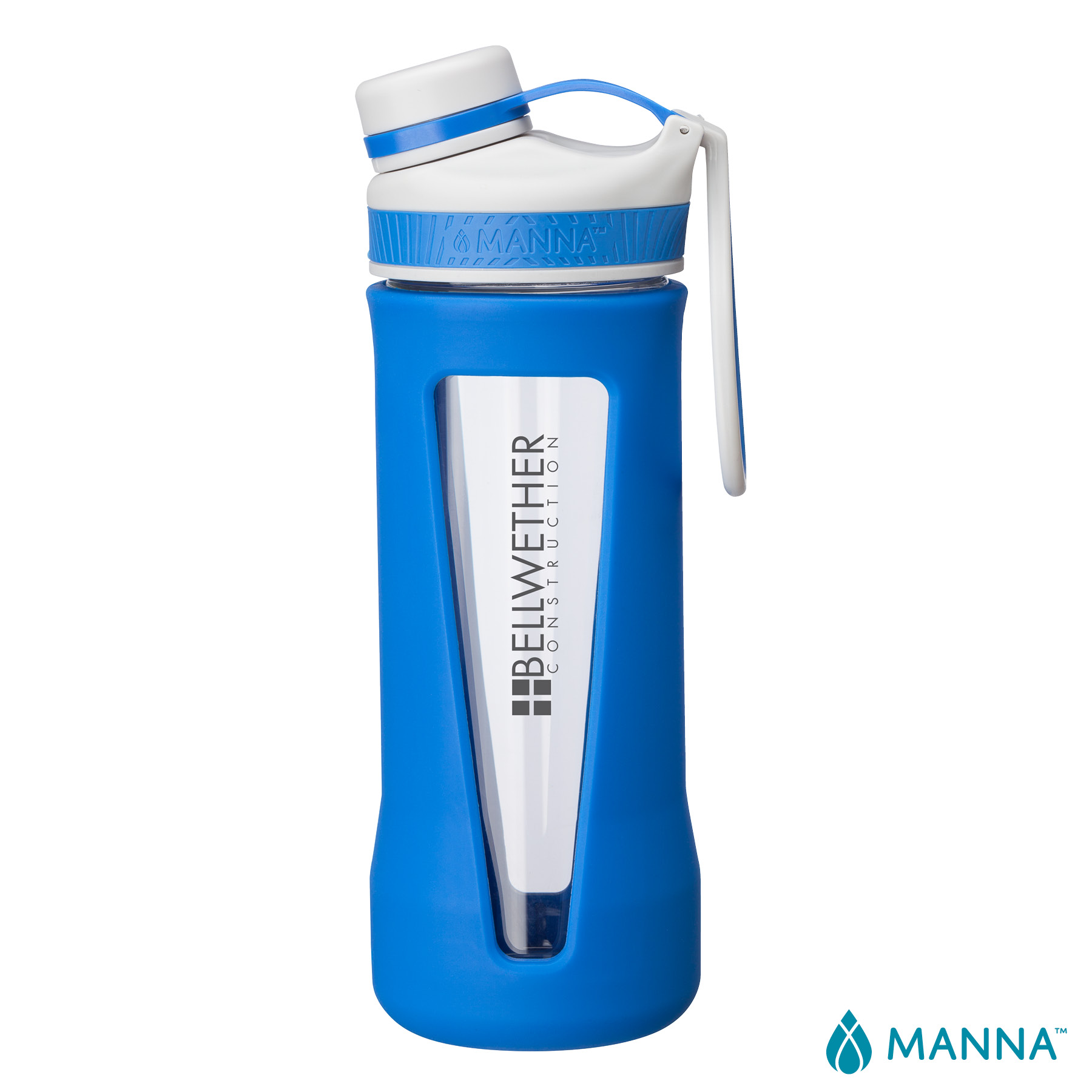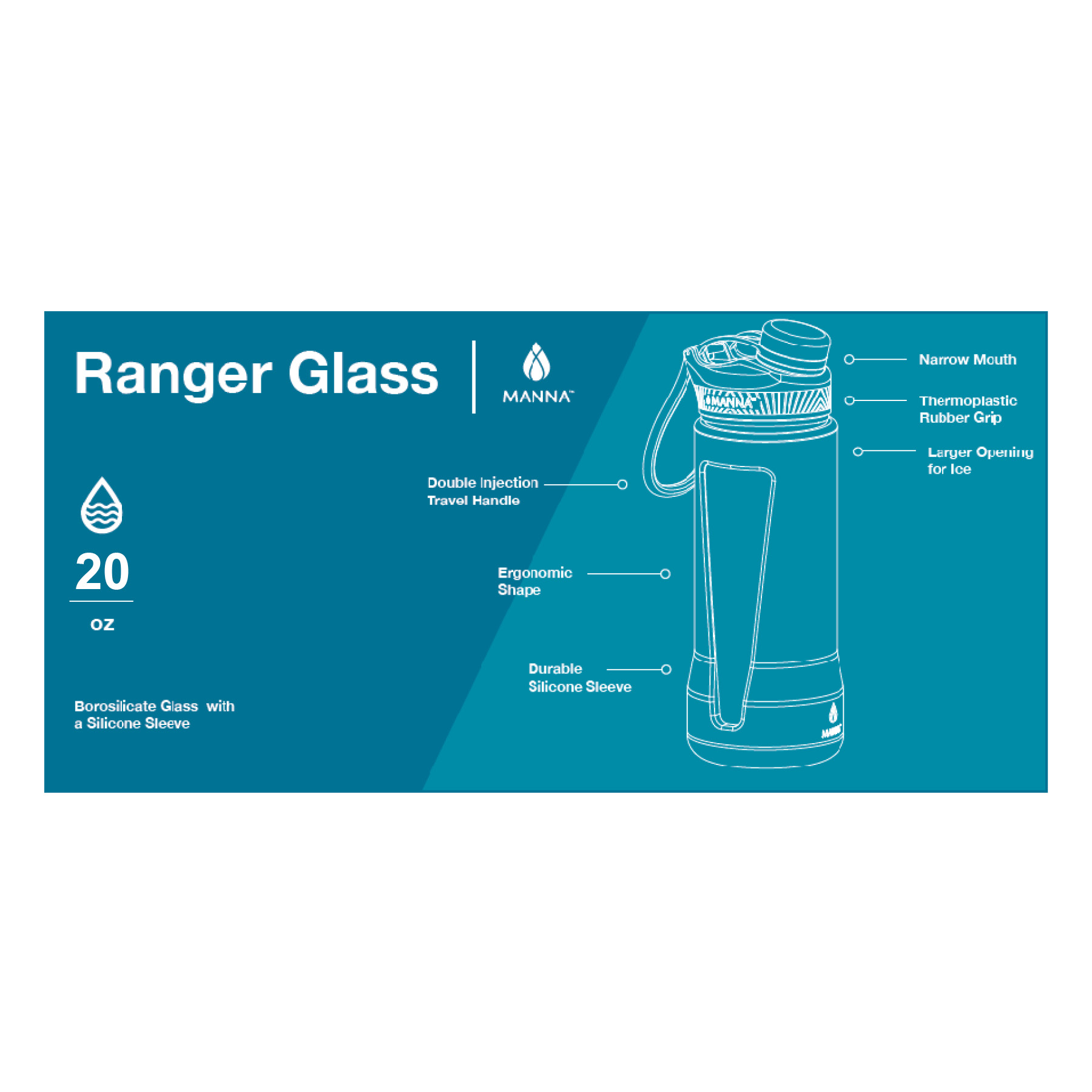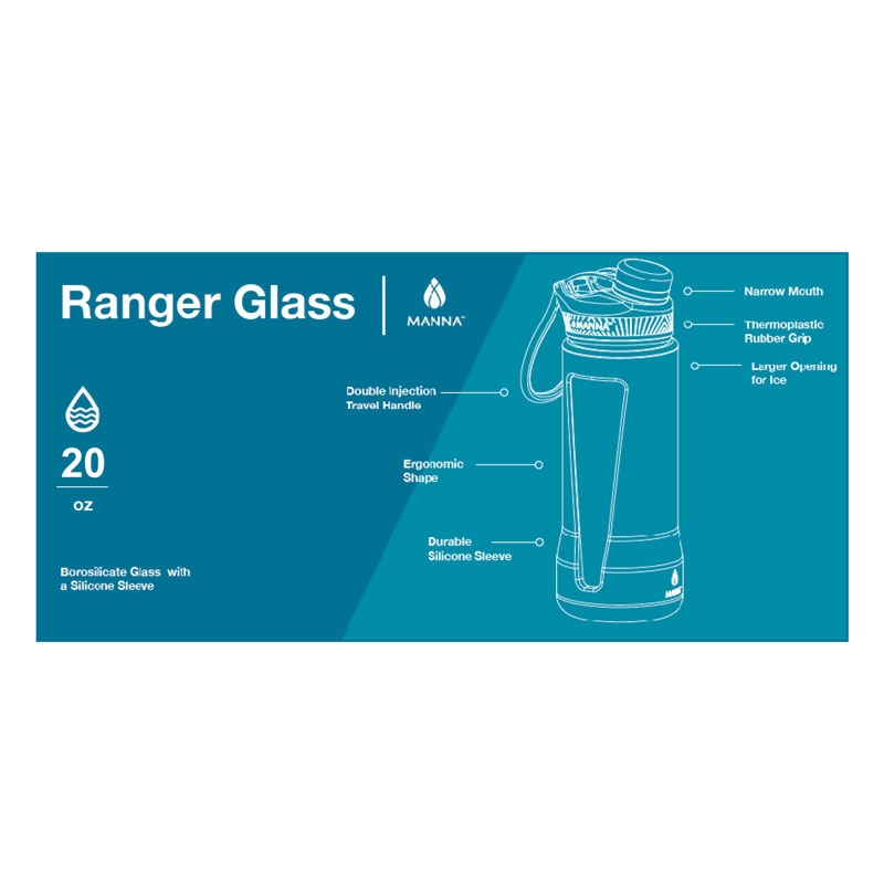 The 20 oz. Ranger Borosilicate glass bottle from Manna™ is a sport and outdoor lover's dream come true. Its leakproof twist off lid with textured double injection grip and hinged carry loop allow you to carry this bottle anywhere. It has a colored silicone sleeve that matches the lid and loop. The lid's design features a small drinking spout with tethered lid, and a larger screw-tight opening for adding ice and easy cleaning. BPA free.