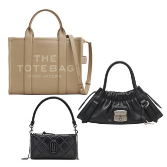 Fashionista, here she comes! A bag for every occasion all in the latest Marc Jacobs trends. First, the Medium Leather Tote, a go-to carryall that's ready for anything you throw in it. This tote features a zipper closure and can be worn by the top handle or the removable leather crossbody strap. Luxe, natural grain leather featuring a debossed signature logo. 13" L x 6" D x 11" H. Strap 57" L x 2" D. Next, elevate your everyday look with The Cristina Small Satchel -a compact yet sophisticated essential designed for modern style and versatility. Crafted from 100% lamb leather with a smooth, luxurious finish. Measuring 3.07" x 12.4" x 3.74". Top Handle, Removable and Adjustable Leather Strap. Just as iconic - The Quilted Snapshot Shoulder Bag. A sleek essential for day-to-night plans, this convertible shoulder bag is crafted in plush quilted smooth leather and finished with our signature J Marc hardware. A removable tubular leather shoulder strap, and a removable refined chain crossbody strap, offering multiple ways to wear-or carry it solo as a pouch. 9in L x 2in D x 5in H.