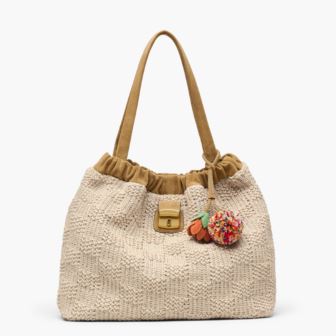 Who is she? Shes effortless, yet everything you need. Inspired by the archives, this tote redefines classic style with heritage hardware and signature scrunch detailing - all brought to life in a two-way weave with a unique textural finish that creates a checkerboard-like effect. Top handle is suede. Two-tone suede flower charm and mixed material pom-pom charms both add a funky flair (and are removable). Spacious enough for a 13-inch laptop, yet featherlight in feel, shes made for moving through the day with ease. Dimensions: 11.81in H x 4.72in W x 14.17in L