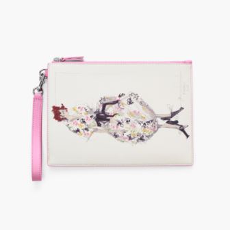 This smooth leather wristlet features colorful illustrations from the Spring 2025 runway collection by Marc himself. A top zip closure keeps everything safe. Easily store cards inside with three card slots. Use as a wallet or wear as a wristlet with a removable strap. Dimensions 7.13 H x 0.98 W x 10 L