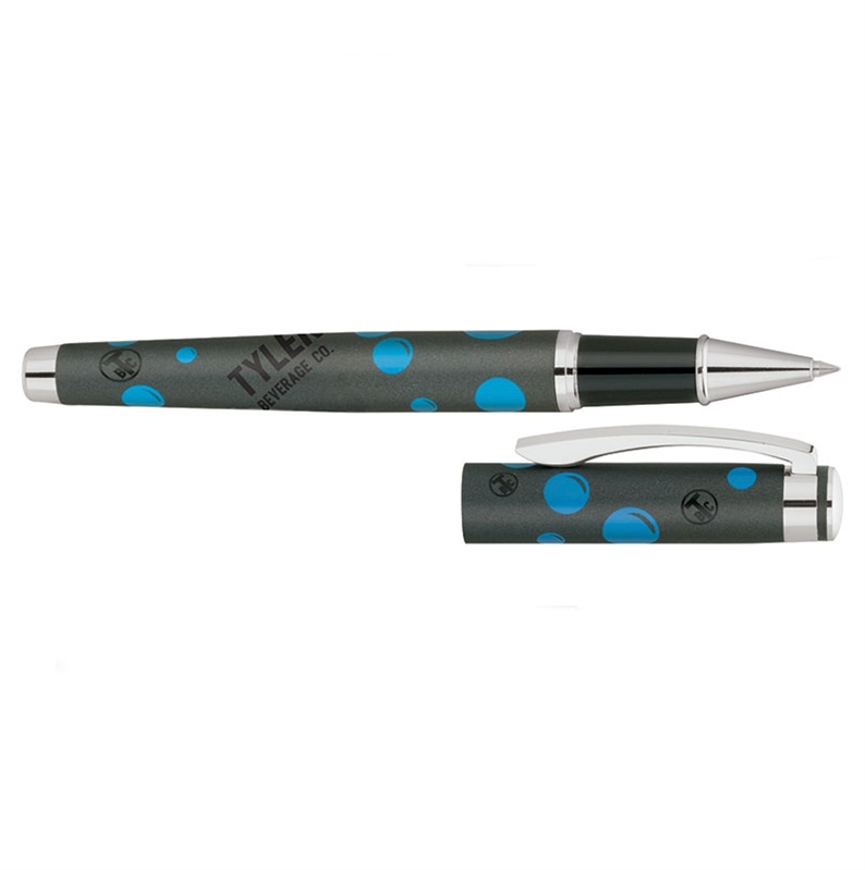 Full wrap printed cap & barrel design, solid brass construction, shiny chrome trims, and black ink.