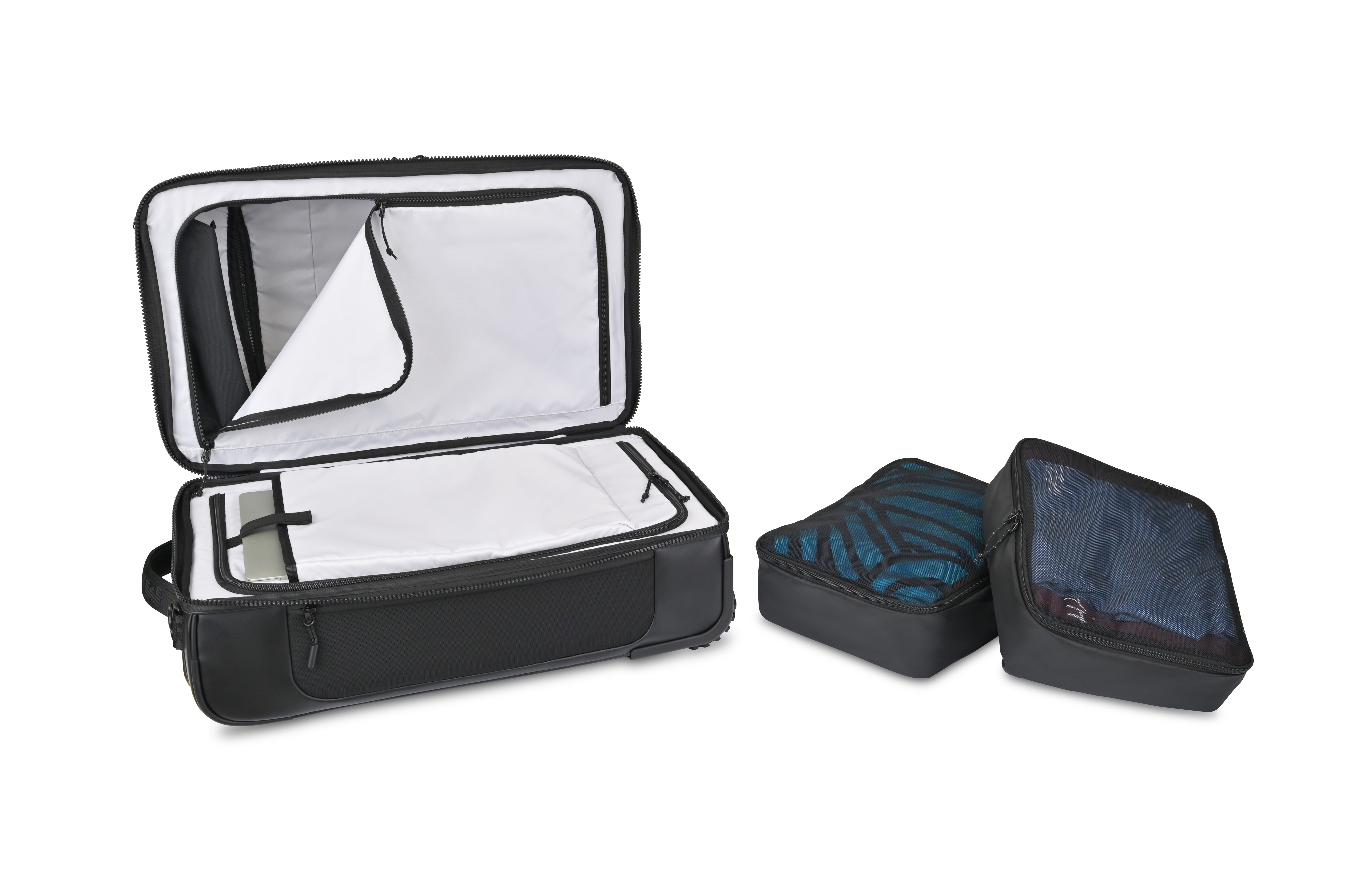 The MiiR® Bahia 50L Wheeled Duffel is built for work trips and weekend adventures alike. Made with recycled materials and TPU coating, it features dual compartments with packing cubes, a 15" laptop sleeve, tricot-lined quick-access pocket, and oversized wheels for smooth rolling on any terrain.