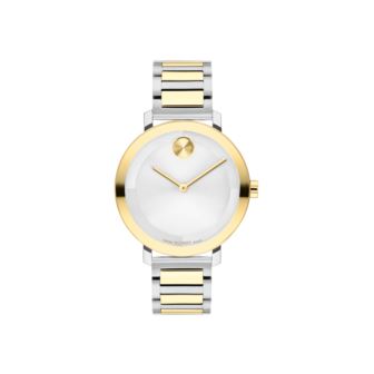 Movado BOLD Evolution 2.0 Ladies. The evolution of modern design with a sharp look and elevated feel. This mix-metal timepiece is crafted from stainless steel and pale yellow goldtone ion-plated stainless steel. It features a statement-making 34mm case that houses a captivating micro-textured silvertone dial with a glossy lacquer overlay, slim goldtone hands, and our iconic dot motif at 12 o'clock. A flexible matching mix-metal H-link bracelet completes the design.