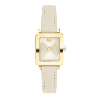 Movado BOLD Quest Ladies. "The BOLD Evolution 2.0 is defined by an elevated, bold case and a dimensional micro-textured dial.Crafted with a Swiss made movement. Designed with a 20mm x 23mm yellow gold ionic-plated mini case. Champagne microtextured dial. Champagne leather strap."